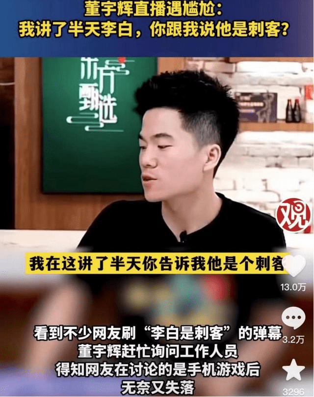 董宇辉询问工作人员之后才知道网友谈的是王者荣耀游戏中的李白。他无奈的表示:“我讲了半天李白,你跟我说李白是刺客,如果有一天我的孩子长大,他跟我说李白是刺客,我应该挺难过的吧。”言辞中透露出颇多失落。事实上,此前四川一位小学老师也曾在课堂问学生:“李白是什么人?”结果有超过一半的学生回答:刺客。有专家称之为“历史认知的冲突”。