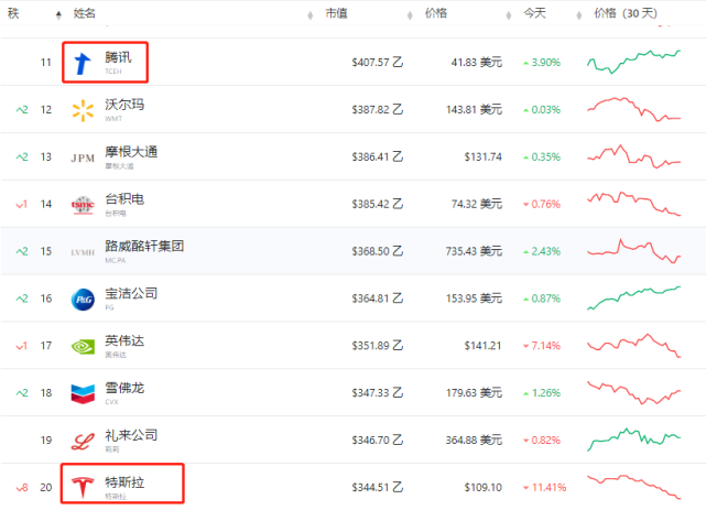 事实上,这已是特斯拉股价连续七个交易日下跌。若将时间线拉长,特斯拉的股价年内已累计下跌近七成。据全球上市公司市值排行网Companies Market Cap数据显示,截至发稿,特斯拉的市值已被腾讯控股超越,腾讯控股排在榜单第11位,而特斯拉的排名已跌至榜单第20名。