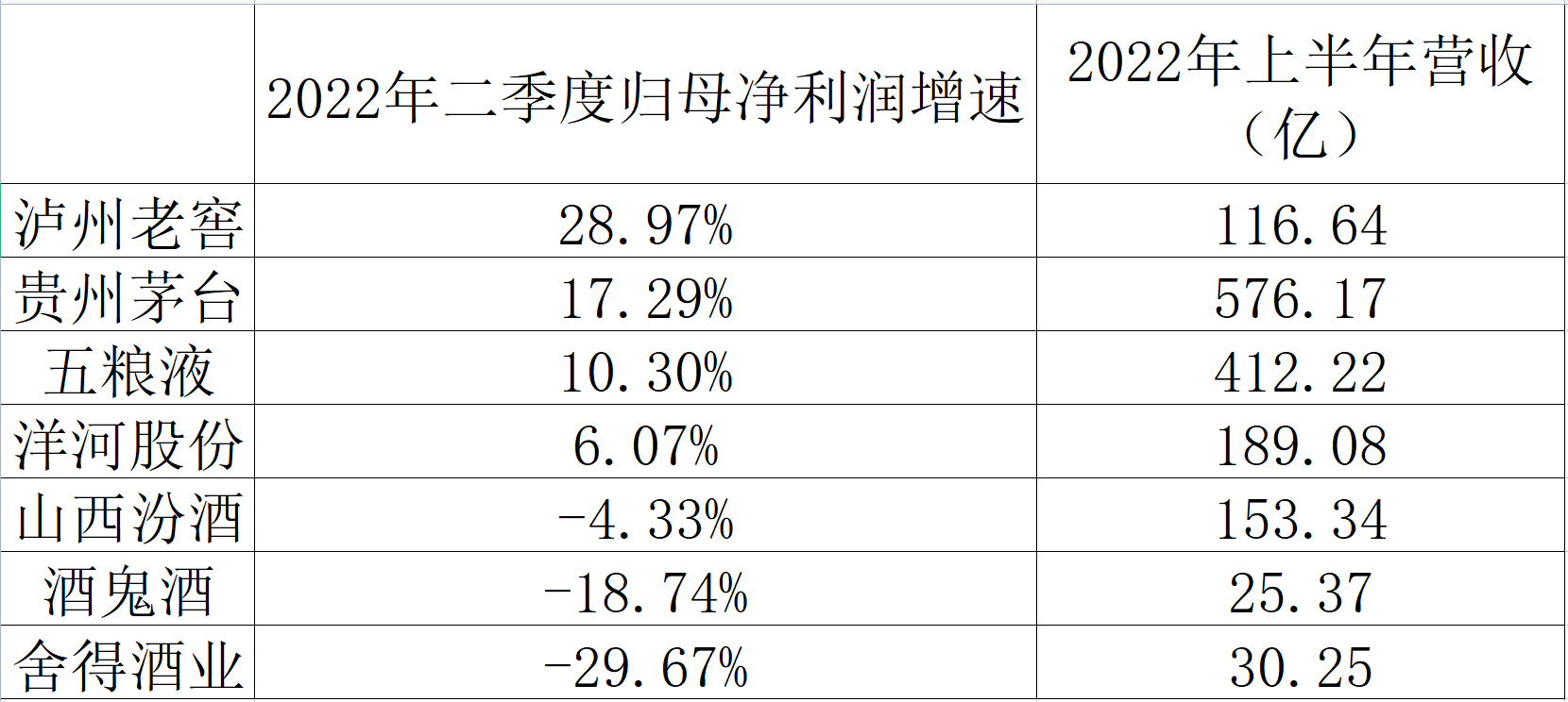 除了酒鬼酒,二季度归母净利润降速的还有舍得酒业(600702.SH),大幅下滑29.67%,与之相反的是,大多龙头酒企二季度归母净利润增速大幅上升,除了山西汾酒(600809.SH)增速小幅下降4.33%,泸州老窖(000568.SZ)、贵州茅台(600519.SH)、五粮液(000858.SZ)等头部企业位列前三,分别为28.27%、17.29%、10.3%,洋河股份(002304.SZ)二季度归母净利增速6.07%。由此可见,白酒企业业绩分化加剧。