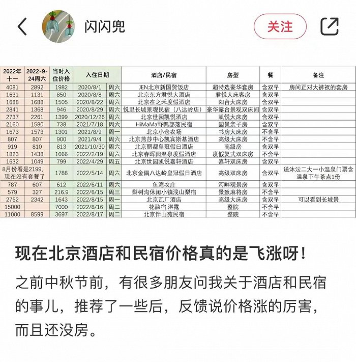 有媒体曝出,小红书网友“闪闪兜”发文披露了一组自己曾经预订过的北京周边酒店民宿价格对比数据,今年8月份支付7000元就可整租的民宿院子国庆期间涨价近一倍,再次预订已经升至15000元,还有涨价近三倍的,从8月份3697元/晚飙升至11000元/晚。