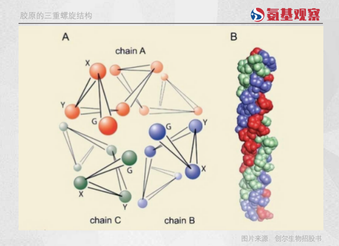 而胶原蛋白分子结构复杂,需要三条肽链去形成三股螺旋的结构,这导致细菌发酵过程中存在一些难点,比如肽链长(需连接1000多个氨基酸),还要保持三股螺旋缠绕结构(完整的三螺旋结构才能发挥胶原理化特性、生物活性)等等。
