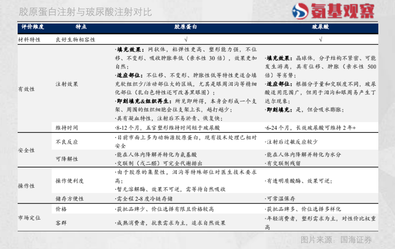 不过,医用敷料市场门槛较低,竞争激烈。相较而言,医美注射领域壁垒更高。如下图所示,与玻尿酸相比,胶原蛋白填充剂优势在于填充效果与促使再生,劣势在于时效与定价。