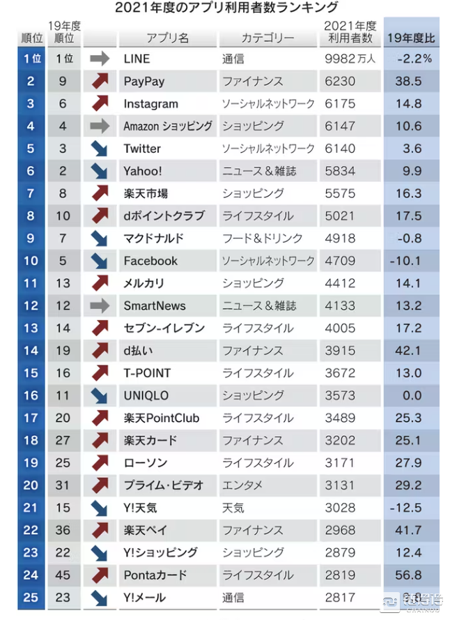 在线支付中,PayPay 的使用率目前最高,Linepay 和 aupay 等也有一定的体量。但是,因为 Paypay 在日本的布局最早,截止 2022 年 4 月,其全国市场占有率占到 66% 以上。2021 年日本 APP 数据调查也显示,Paypay 用户数据比两年前增长 38%,反而 Line 有所下降。