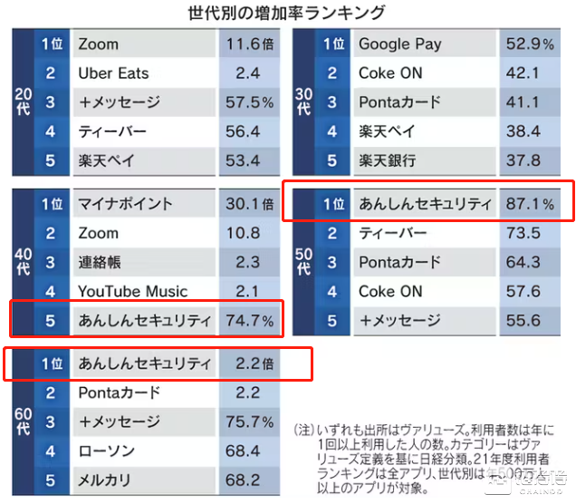 在针对日本 40 岁以上的人使用的APP调研中,链得得编辑发现,一个付费 App“安心安全(あんしんセキュリティ)”均位列榜首。中老年人群对于密码和个人信息、骚扰电话的戒心十分重,对于在线支付更是敬而远之,60 岁以上的人对这个付费 App 的使用更是在短短 2 年增长了 2.2 倍,成为 50 岁以上人群中使用最多的 APP。