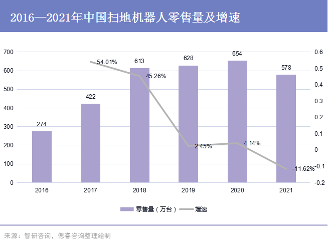 从量上看,扫地机器人零售量增速从2017年的54.01%,下滑至2021年的-11.62%,2021年甚至出现了销量绝对值的下降。