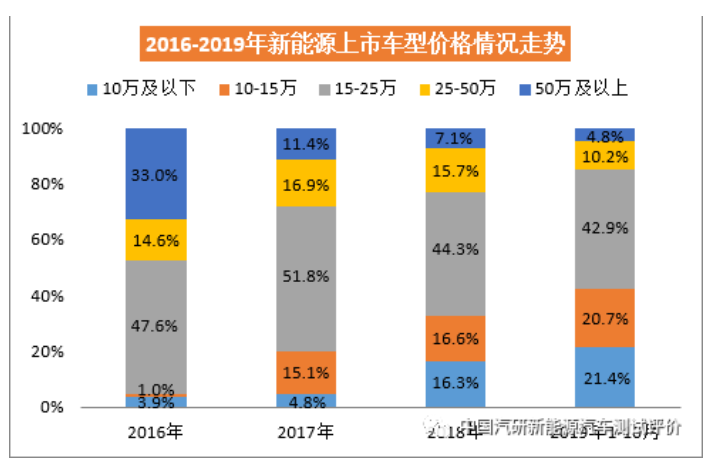 比如,新能源汽车的价格是逐渐下探的,数据表明,2016年,15万元以下车型占比仅为4.9%;2019年,这一价位的车型占比涨至42.1%,价格逐渐下降带来市场渗透率的提升,中国汽车工业协会数据,新能源汽车市场渗透率从2016年的1.8%,上涨至2019年的4.6%。
