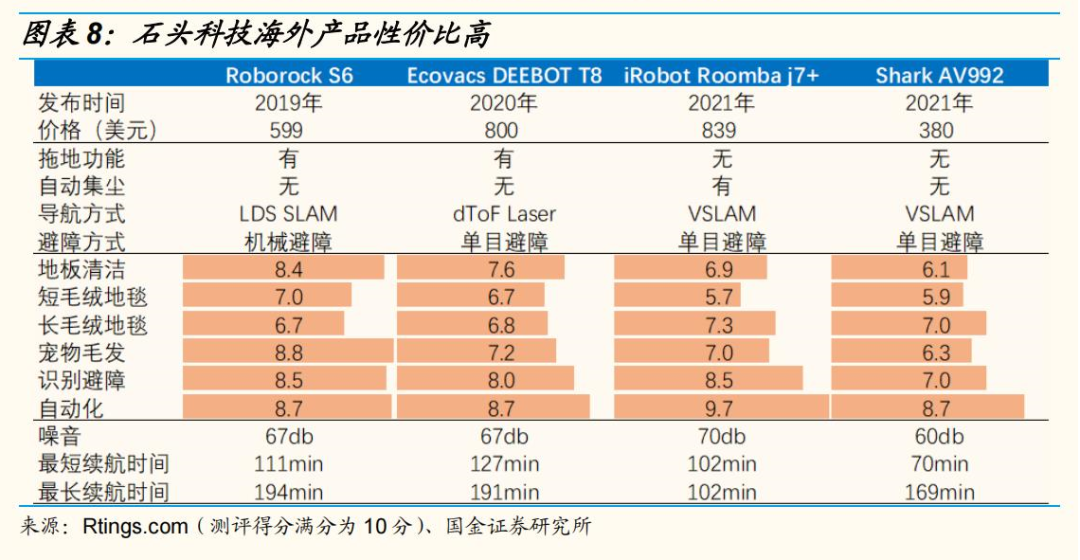 它的市场格局良好——iRobot 和Shark双寡头,而且石头科技打得过。Rtings网站选取了石头科技、科沃斯、iRobot 和Shark四个国际品牌的旗舰级进行产品力对比,发现,石头科技性价比较高。