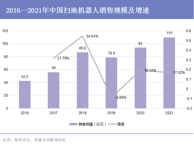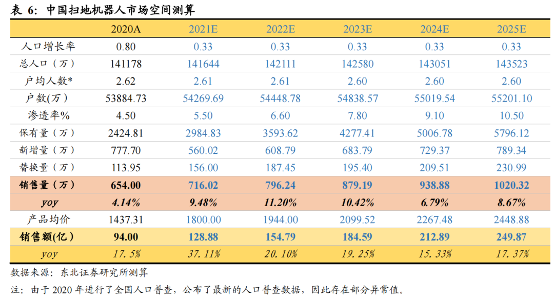 彼时,根据东北证券对我国扫地机器人市场空间的测算,2020年,扫地机器人销量654万,预计到2021年销量增长9.48%,渗透率突破5%,整个市场规模也将从94亿增长至近130亿。