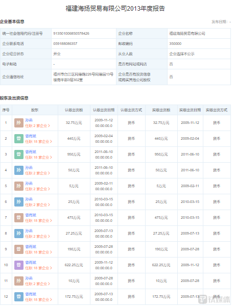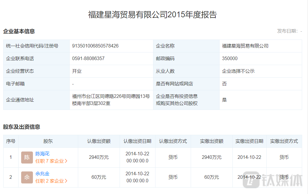 除此之外,钛媒体APP注意到星海贸易成立于2009年,其2013年年报显示,公司的股东主要是孙燕和曾而斌。而陈海花、余兆金在2014年才成为了星海贸易的股东。