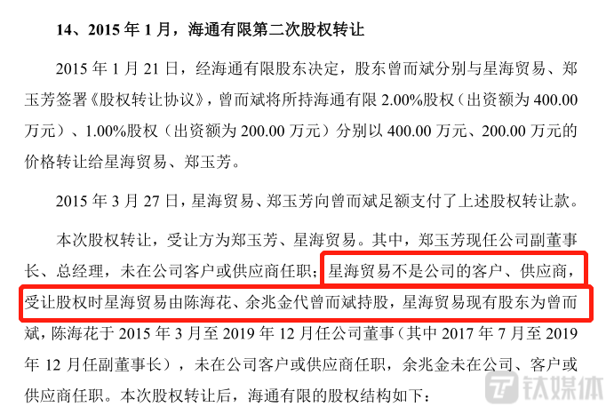 2015年1月,曾而斌分别与星海贸易、郑玉芳签署《股权转让协议》,曾而斌将所持海通发展2%股权、1%股权分别转让给星海贸易、郑玉芳,海通发展首次引来了新股东。