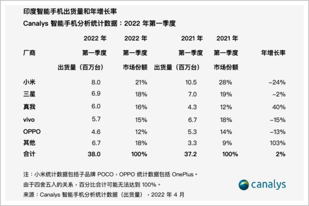 在印度智能手机领域,中国企业更是几无敌手,小米、真我、vivo、OPPO一共占据了印度64%的智能手机市场,印度本土的智能手机品牌则被归入“其他”当中,根本不值一提。