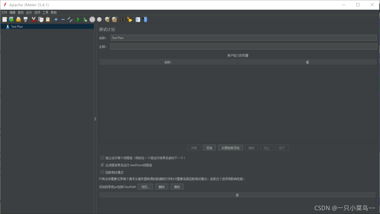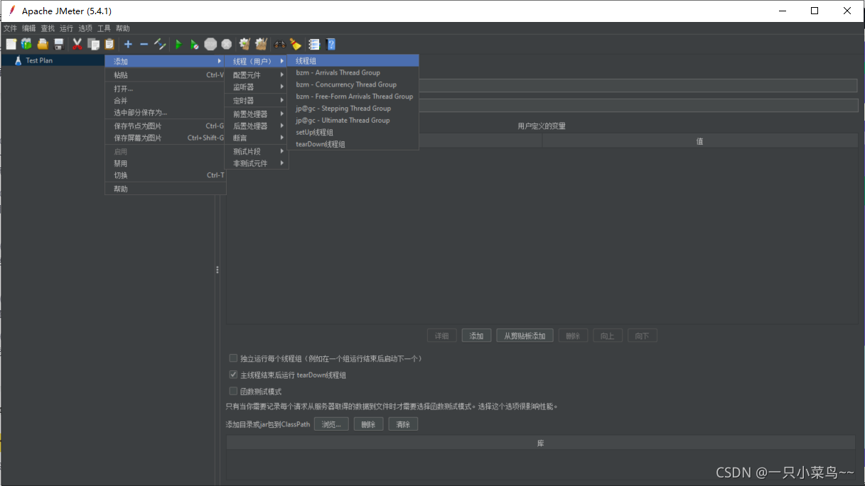 ** 添加目录或jar包到ClassPath:**一般用于添加jar包配合着Beanshell使用,jmeter的lib目录下添加了新的jar包,需要重新启动才会生效