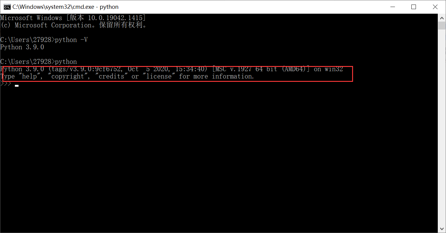 3、win+R ,运行cmd。输入Python -V将会得到对应版本。(我之前安装过,此处显示版本与前文不同)输入Python检查。