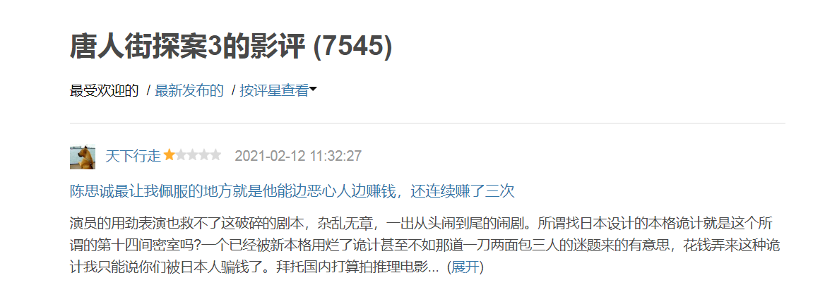 今年年初,春节档电影的高票价劝退了一大波翘首以待的消费者,很多网友表示“被价格劝退”,特别是有些地方大年初一的《唐人街探案3》IMAX厅票价竟然高达100元。年轻人对电影的热情再一次被磨灭,再加上最受到大众期待的《唐人街探案3》口碑翻车,让很多消费者对电影院的好感直线下滑。
