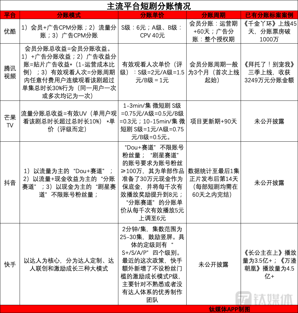 此外,还有“千万爆款剧乐部”计划,面向广大MCN和专业影视制作公司,以投产保底+300%收益现金分账+流量激励方式,对短剧创作者进行扶持激励。