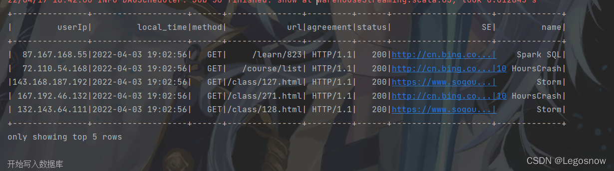 一次脚本的完整运行,将会一次性产生2000条日志,以追加的方式平摊在文档中。根据脚本的编码,产生一条正确完整的Web日志的概率仅为20%,即一次运行,只有400条左右的日志会存入数据库中,详情可查看步骤2)