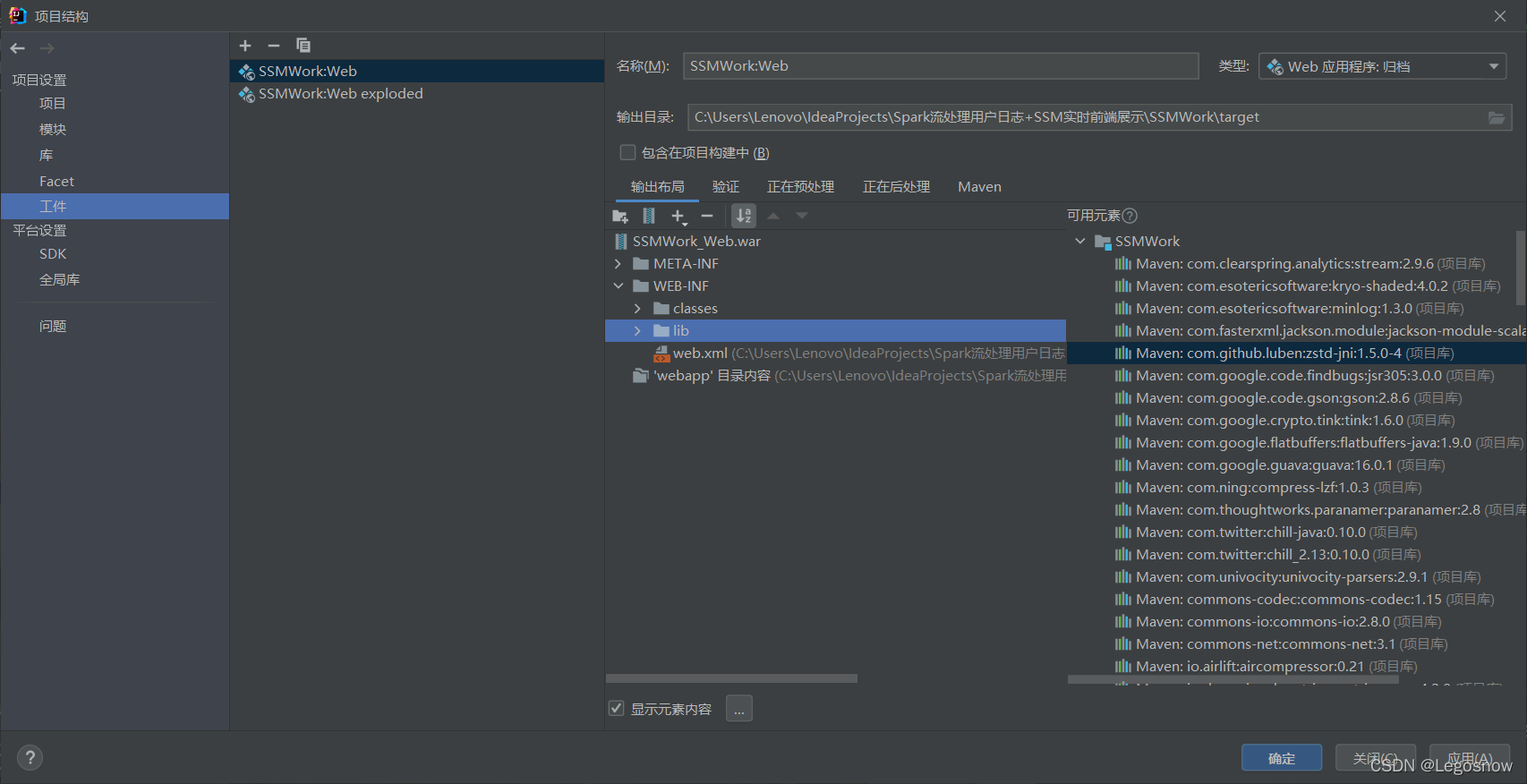 一般此时IDEA会提醒你发现Web,是否配置Web框架,点击配置,前往“项目结构”,为Web配置工件,将右边SSMWork的与SSM相关的元素带入SSMWork_Web war中