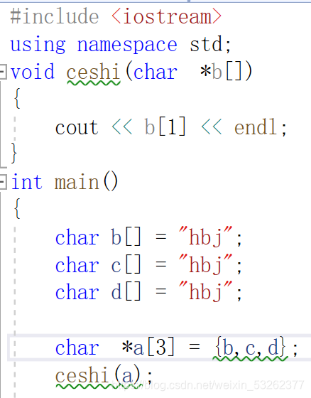 注意这个三下的示例是双指针型a[]是存储的一组指针变量,这个时候a是存储地址的地址啊;a[i]依旧是地址,a[]这种写法作为函数参数的传递是第一种的写法的深究与继续探讨,(建议把第一种情况打下来,然后想一想,再作探究)。