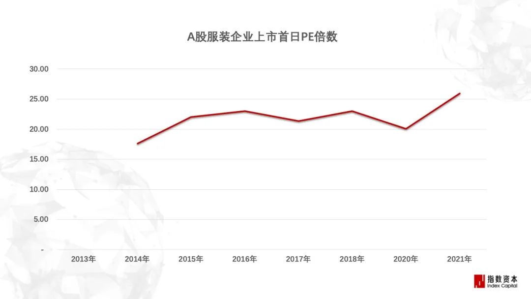 前述28家A股服装企业,在上市首日PE倍数上未呈现大的起伏,基本都在22~23倍之间。