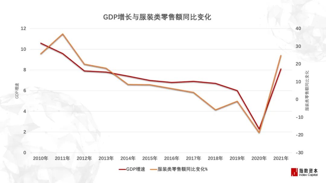 ▲GDP增长与服装类零售额同比变化(数据来源:wind,图源:指数资本)
