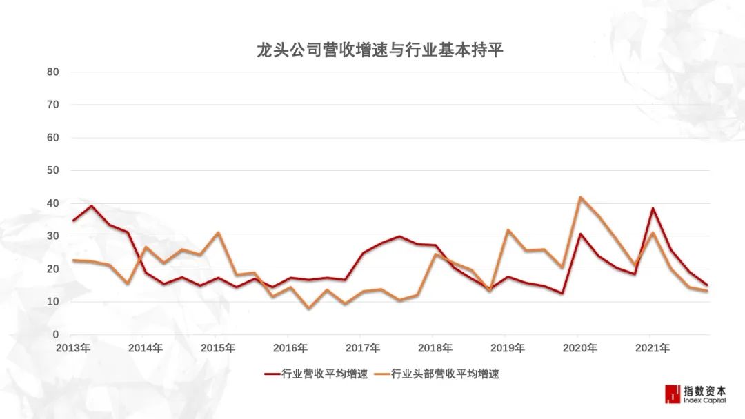 目前行业内的龙头公司主要在规模体量上表现突出,但核心竞争力未呈现更高壁垒,整体增速亦和行业大盘增速基本持平。