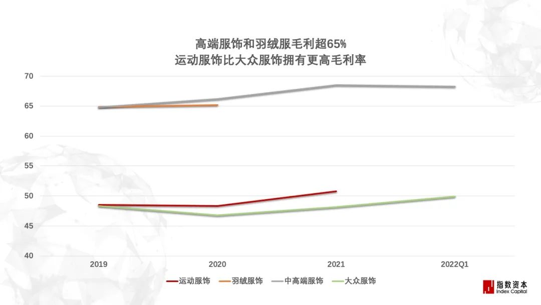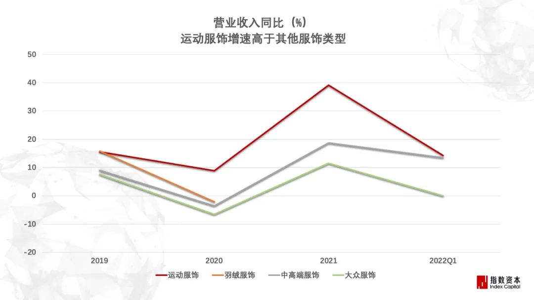 ▲从头部上市公司财务数据来看,运动类服饰优势显著(图源:指数资本)