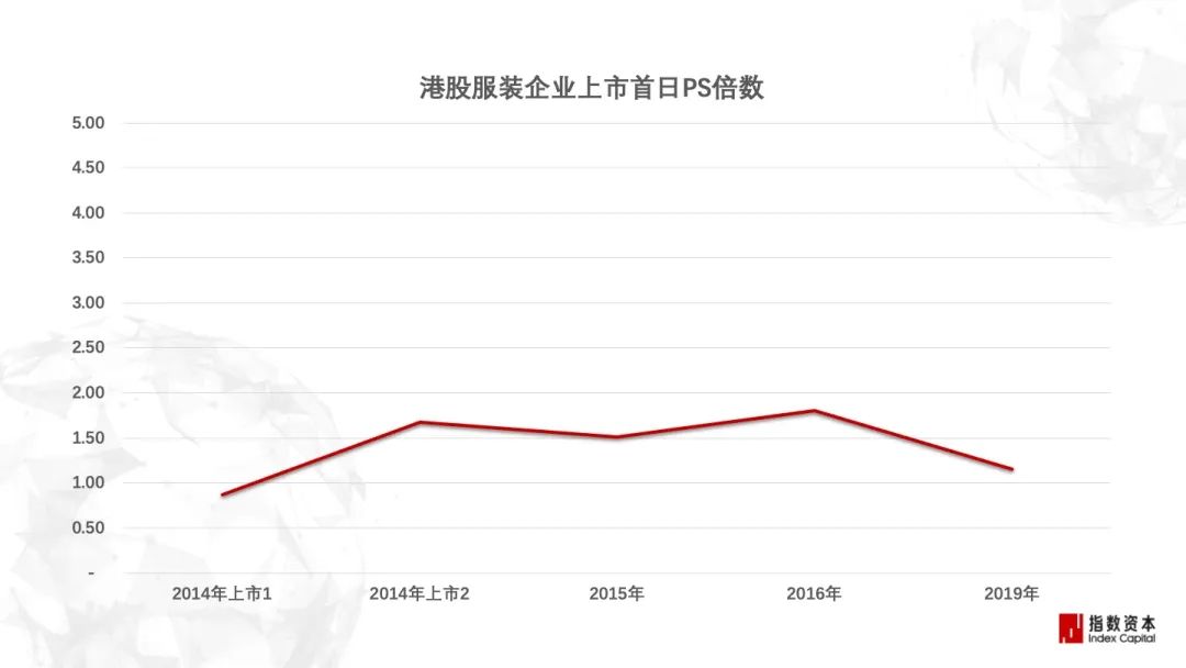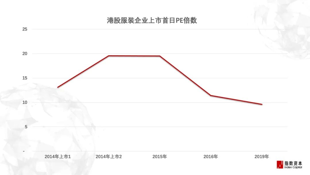 ▲港股服装企业上市首日估值趋势(注:2013年、2020年和2021年无服装企业登陆港股;图源:指数资本)