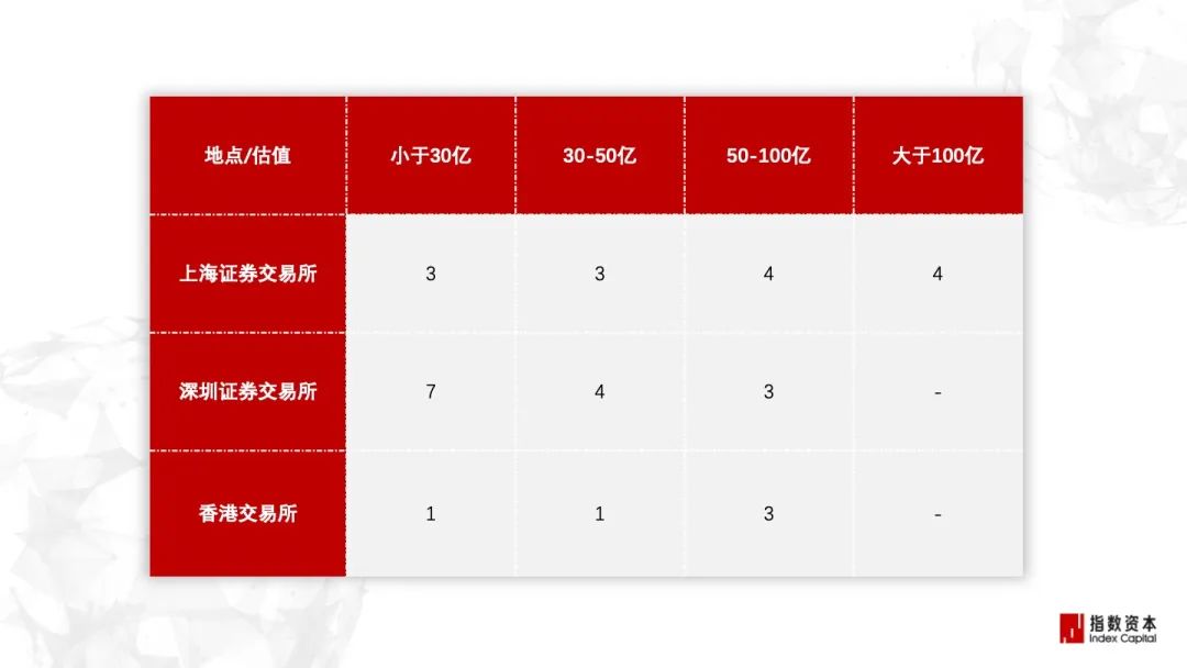 再看上市首日市值,港交所、上交所、深交所的上市首日市值平均值分别为57.9亿人民币、71.9亿人民币及36.3亿人民币。