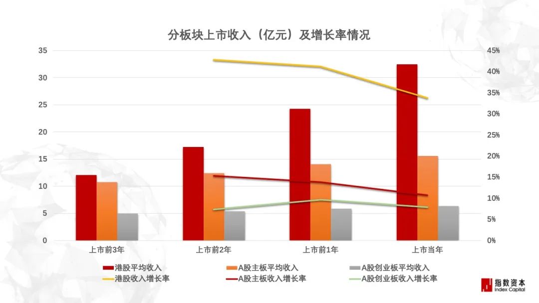 整体来看,港股上市公司收入规模最高,上市当年平均收入达30亿元人民币,且收入同比增长维持在40%左右;A股主板和创业板上市公司平均规模较小,上市当年平均收入15.6亿,同比增长率10%左右。