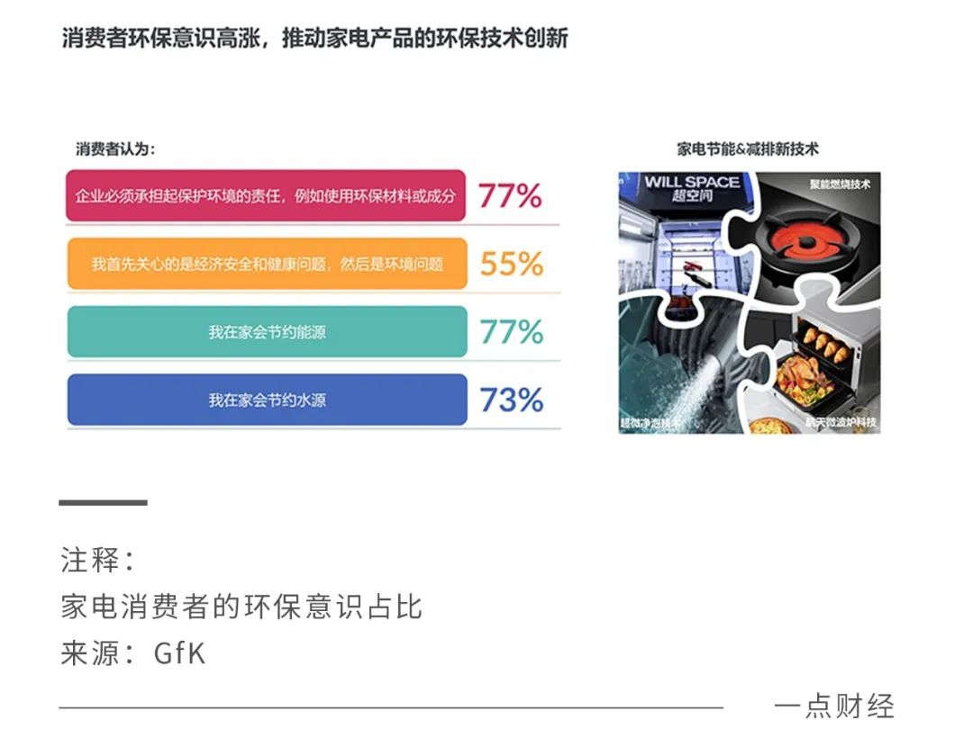 家电消费者的环保意识也日益高涨,GfK调查数据显示,有77%的消费者认为“我在家会节约能源”、“企业必须承担起保护环境的责任”。
