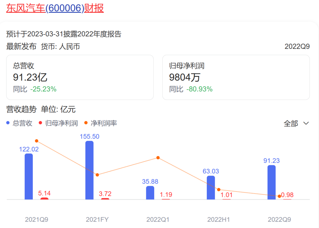 财报显示,东风汽车在2022年前三季度总营收91.23亿元,同比2021年同期的122.02亿元下滑了25.23%,归母净利润0.98亿元,同比2021年同期的5.14亿元暴跌80.93%。2022年第三季度总营收28.21亿元,同比下降16.01%,归母净利润-275.04万元,同比下降128.59%。