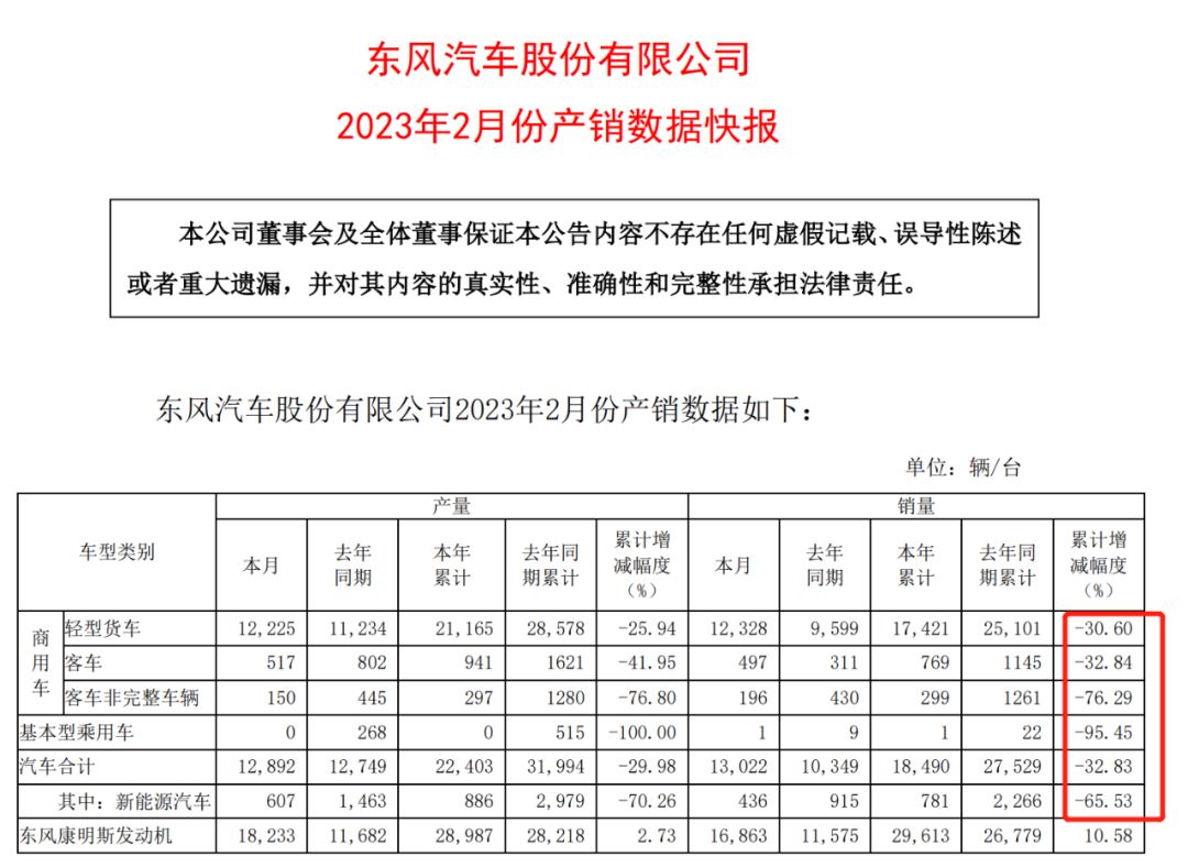 在东风集团3月8日发布的公告中披露,2023年1-2月累计汽车销量为262,285辆,同比下降48.48%。母公司东风汽车集团1-2月累计汽车销量为296,796辆,同比下降49%。公司旗下东风汽车股份1-2月累计汽车销量为18,490辆,同比下降32.8%。整个公告中除了东风康明斯发动机出现10.58%的增幅之外,其他都是下滑。(如下图)