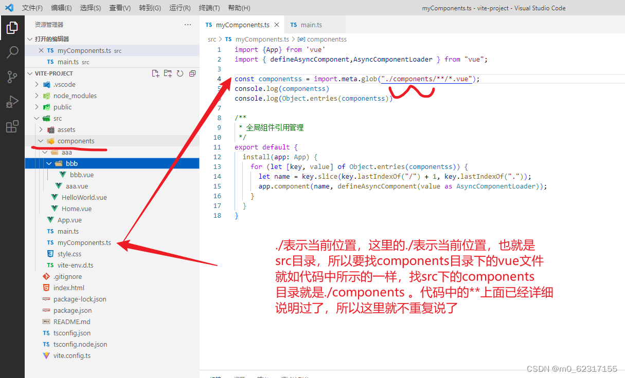 如下图所示,这里注意看下图中myComponents.ts文件所在的位置,以及对应的目录位置,我们要找的是使用了import.meta.glob(“./path/*.vue”)的ts文件对应需要扫描的文件夹的位置。具体看下图就知道了