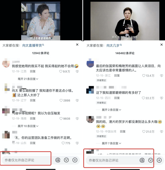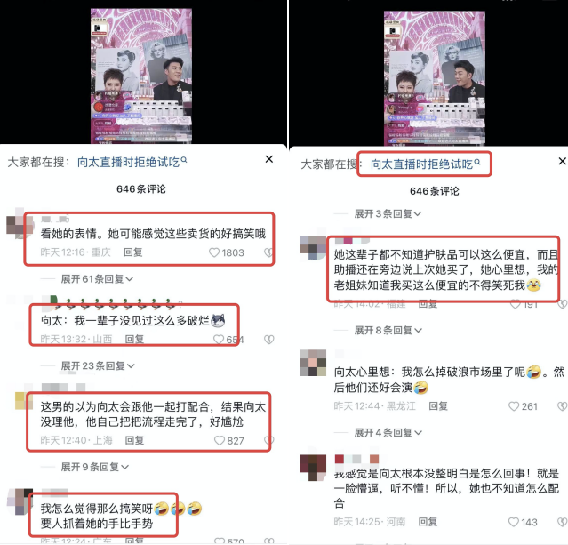 直播结束后,网上到处是关于向太首播内容的负面评价,其个人抖音账号评论区已经关闭。