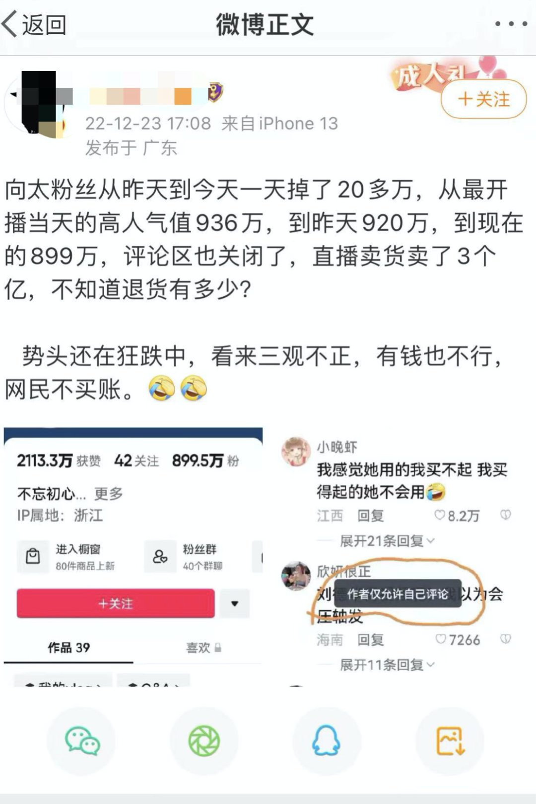 “向太粉丝从昨天到今天一天掉了20多万,从最开始当天的高人气值936万,到昨天的920万,到现在的899万,评论区也关了。直播带货卖了3个亿,不知道退货有多少?”微博上某位500万粉丝播主发微博如此评论陈岚的首播情况。