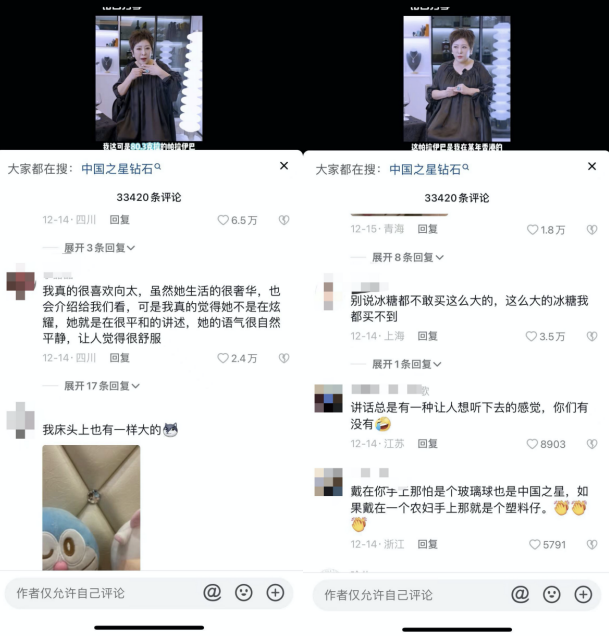 在抖音账号上,陈岚一贯在视频中展示自己的珠宝首饰,大家都比较有兴趣,对她的评价还是比较正向的。