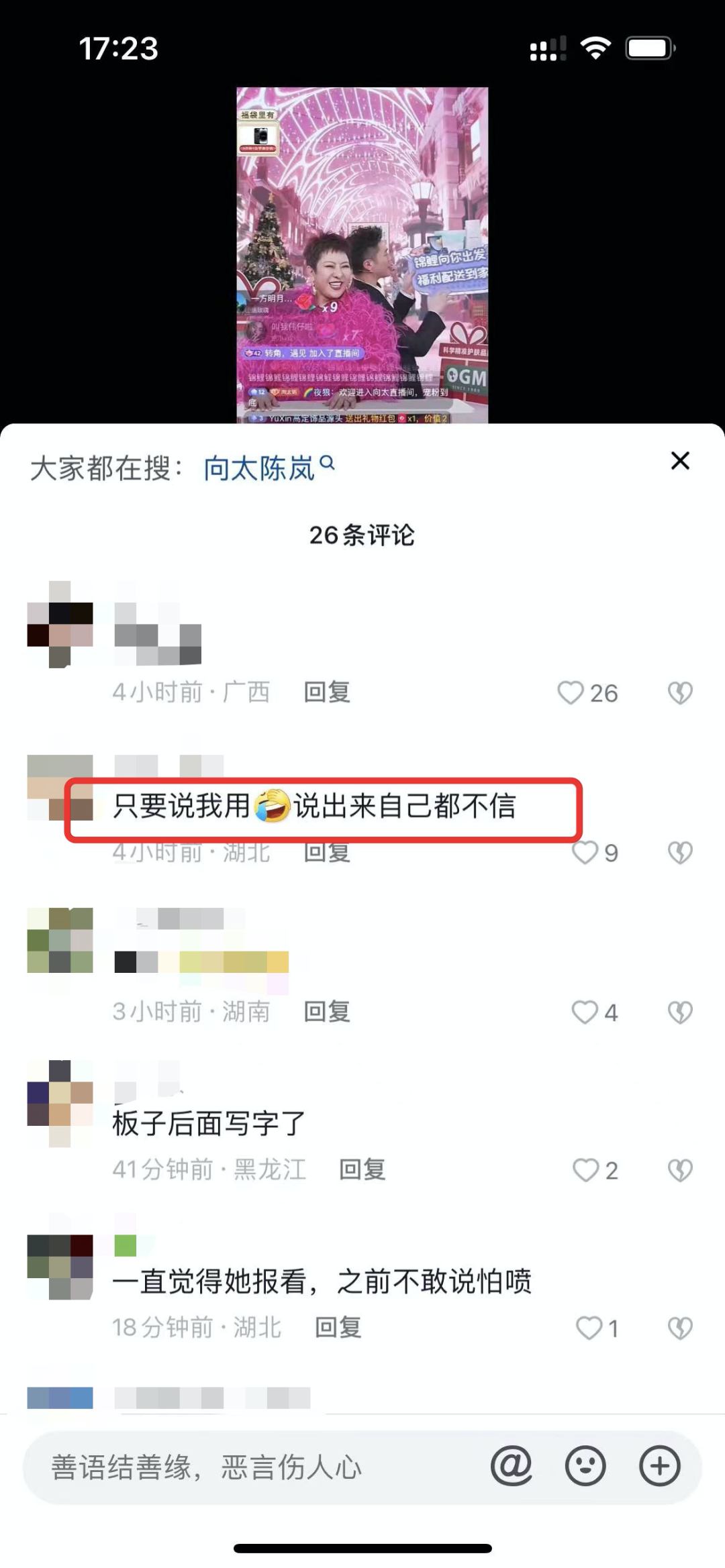 在别的账号视频下方,大家对陈岚的首播带货评论偏向负面。