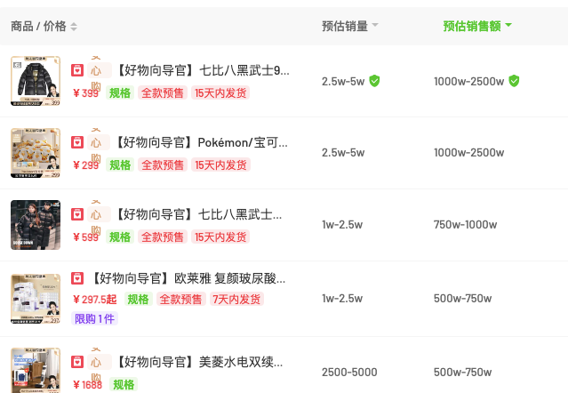 飞瓜数据线上,上午场直播销售额最高的产品是售价399元的七比八黑武士羽绒服,共销售了2.5万-5万款,总销售额为1000万-2500万。