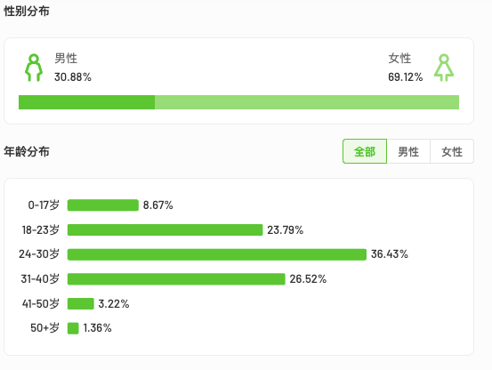 飞瓜数据显示,陈岚直播间用户以女性为主,年龄以24岁至30岁阶段居多。