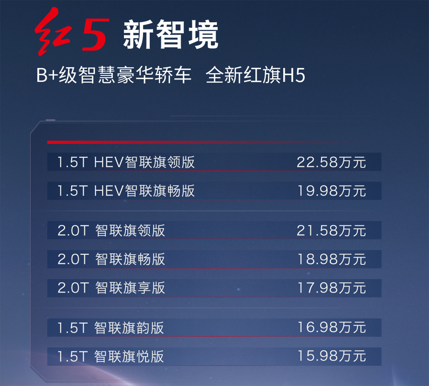 7月26日晚间,全新一代红旗H5正式上市,推出三种动力共7款车型,售价区间为15.98-22.58万元。该车采用了类似红旗H9的最新一代家族化设计语言,提供1.5T、2.0T以及1.5T HEV三种动力供选。据悉,老款车型还将作为经典款同堂销售。