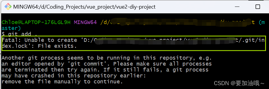 - fatal: Unable to create 'D:/Coding_Projects/vue_project/vue2-diy-project/.git/index.lock': File exists.