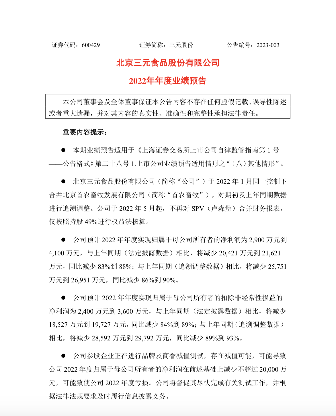 在业绩预告中,三元股份同时提示称公司参股企业正在进行品牌及商誉减值测试,存在减值可能,可能导致公司2022年度归属于母公司所有者的净利润在前述基础上减少不超过2亿元,可能致使公司2022年度亏损。