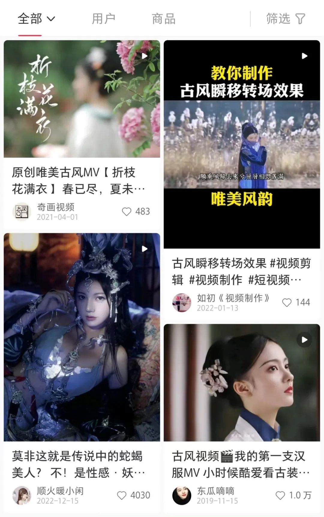 打开小红书或B站搜索“古风视频”,可以看到许多coser、汉服爱好者们发布的古装短视频。这类视频通常强调中式的服装造型和场景,除了部分参考古装影视剧或国风动漫角色进行人物设定外,基本上没有剧情或对白,但是在经过镜头剪辑、后期调色并且配上背景音乐后,也能够贴合影视原作的角色形象,营造出古装氛围感。