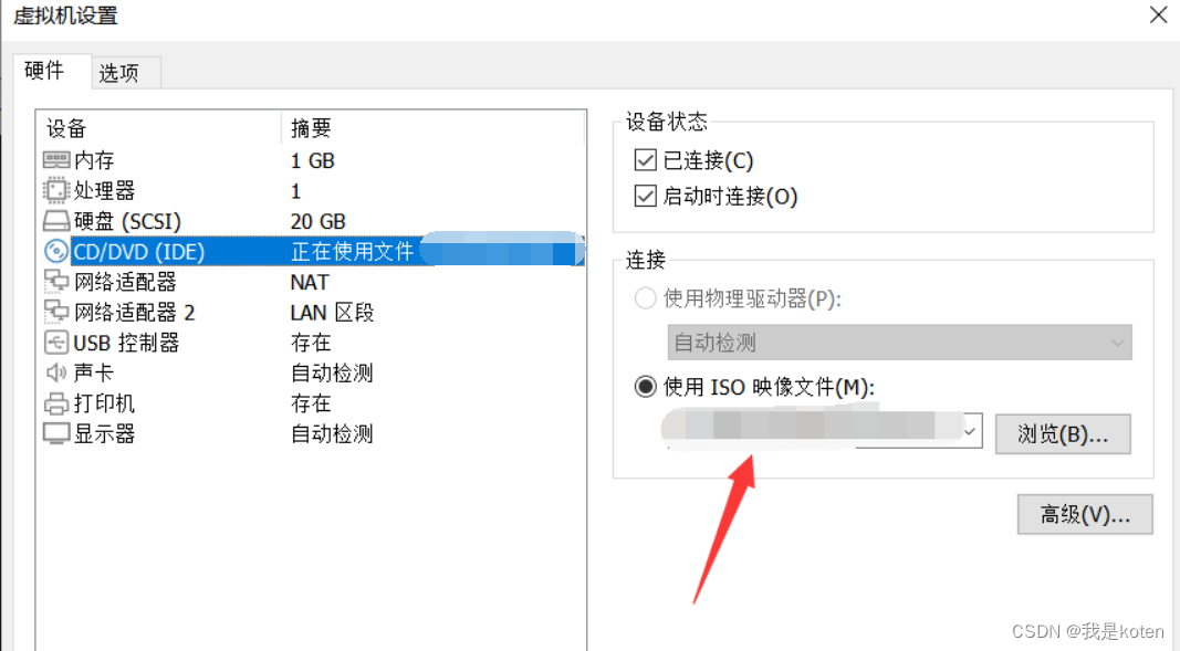 1、虚拟机设置,确保我们正在使用要挂载的镜像,并且设备状态是已连接,启动时连接