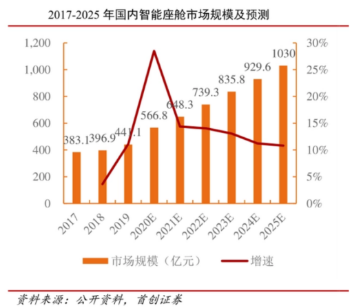 ICVTank预测,2025年中国智能座舱市场将达1030亿元的规模;IHS预测,2030年中国智能座舱市场将达1600亿元的规模。