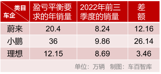 今年前三季度,蔚小理的销量分别为8.24万辆、9.86万辆、8.69万辆。今年,蔚小理要达到盈亏平衡的年销量,几乎不太可能。
