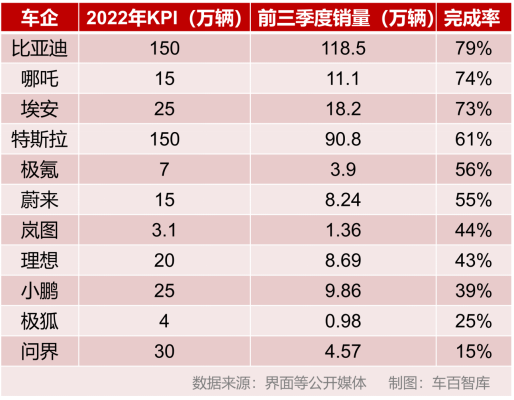 从数据上看,前三季度,仅比亚迪、哪吒、埃安三家车企,KPI完成率超过70%。特斯拉,乃至其他新势力,都面临巨大KPI压力。