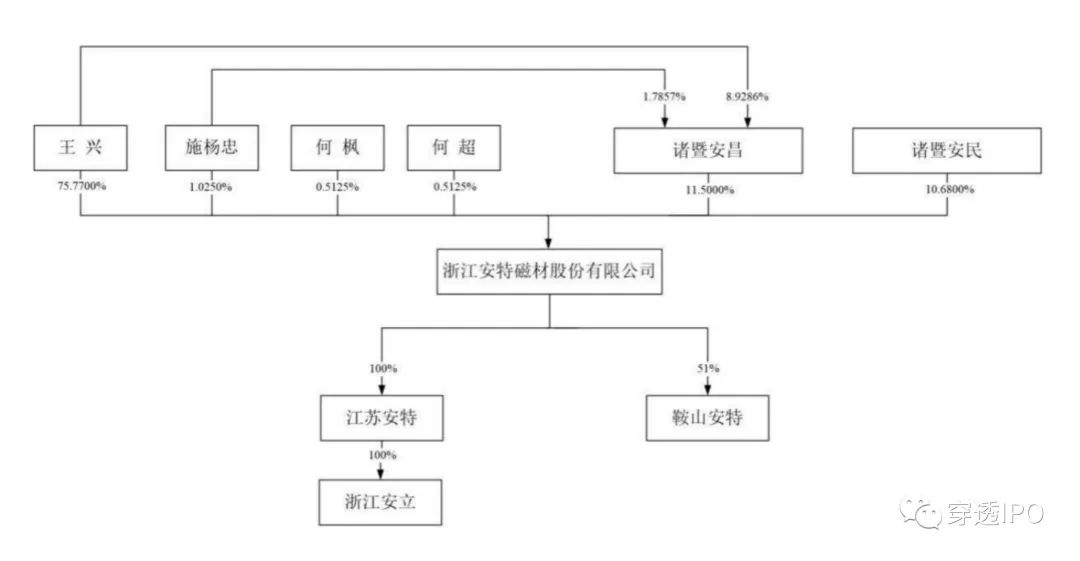 近期,专业从事高性能永磁铁氧体材料的研发、生产和销售的企业,浙江安特磁材股份有限公司(简称:安特磁材)主板IPO获上交所受理,保荐机构为国信证券。王兴正是安特磁材的控股股东、实控人、董事长。