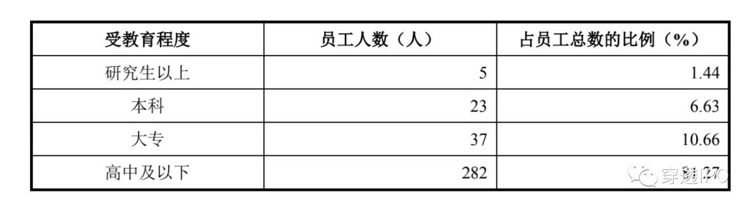 安特磁材目前拥有研发人员24人,占整个员工总数的6.92%,生产人员占比达到68.30%;从学历看,研究生以上学历5人,本科23人,本科及以上文凭占比只有8.07%。高中及以下员工占比81.27%。而且其员工中,有46.69%的员工超51岁。