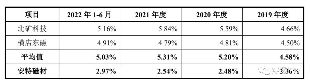 永磁铁氧体材料行业属于技术密集型行业,报告期内,安特磁材研发费用分别为963.19 万元、1097.59 万元、1778.96 万元和958.29万元,研发费用率2.36%、2.48%、2.54%、2.97%,明显低于同行业可比上市公司,也远低于行业平均值。安特磁材称,主要系业务构成存在差异造成与同行业之间研发费用率的差距。